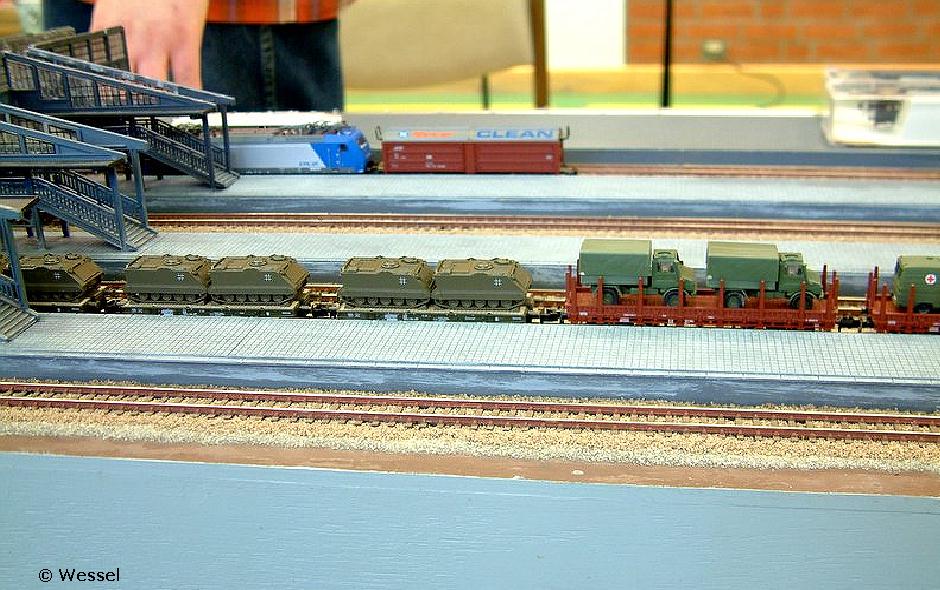 Der Bahnhof wird zwischenzeitlich von einem Bundeswehrtransport durcheilt.